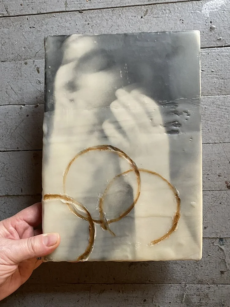 These works are from the series Quiet/Loud which was exhibited in its entirety at ArtProv Gallery November 2017 - January 2018. The show was reviewed in Art New England. Quiet/Loud addresses themes of mediating a complex identity while endeavoring to emerge whole from the muddled soup of being human. Presenting self-portraits beneath encaustic medium quiets the sound of life and surrenders to its insistence.