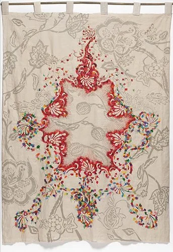 Merill Comeau Woman Interrupted, 2023 discarded linen tablecloth, embroidery threads, stencil inks $5,200
