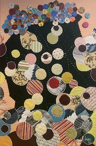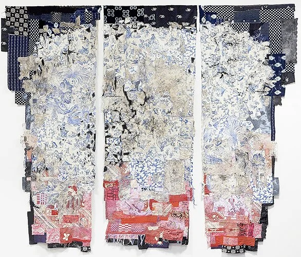 Merill Comeau Cockcrowing, 2017 Composted toile, indigo dyed fabrics, painted fabrics, deconstructed clothing, hand stitching $12,000