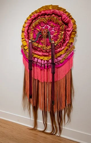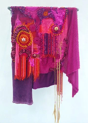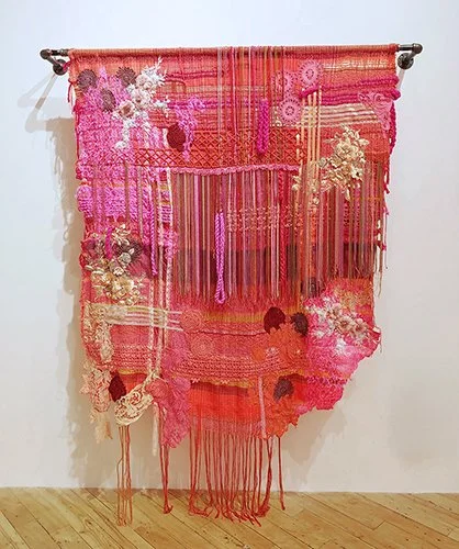 Sam Fields Interwoven, 2024 Hand woven fabric, trim, beads, repurposed appliques, salvaged crochet hand dyed lace pipe fittings/nipples $19,500