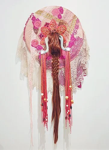 Sam Fields I tasted the fruit and it was good, 2023, fabric, yarn, beads, lace, trim, vitreous china, synthetic hair, crochet, cross stitch, woven cloth, embroidery, pipe fittings/nipples $18,000